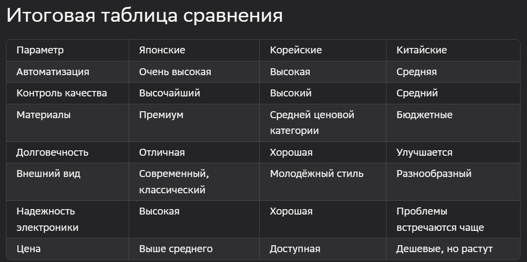 Таким образом, японские автомобили остаются эталоном надежности и долговечности, корейцы уверенно укрепляют свои позиции, а китайцы стремятся догнать лидеров. Выбор конкретной марки и модели зависит от предпочтений покупателя, бюджета и целей приобретения автомобиля.